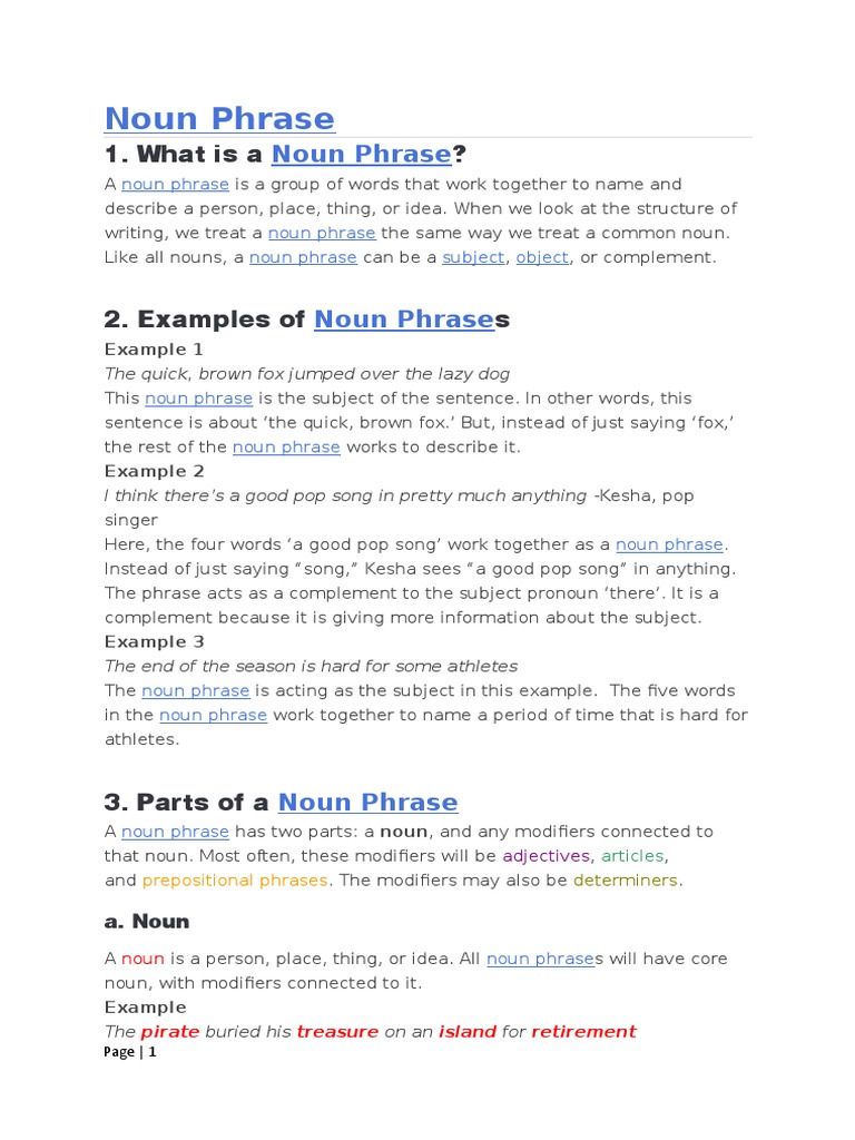 Complex Noun Phrases 1 | IELTSTutors from www.ieltstutors.org The easiest way to identify noun phrases is to replace the phrase with pronouns. Rowling panting, harry fell forwards over the hydrangea bush, straightened up and stared around. These example sentences are selected automatically from various online news sources to reflect current usage of the. A noun phrase is a word or group of words in a sentence that acts like a noun. Those houses are very expensive. A noun can combine with adjectives, adjective phrases and adjective clauses to form noun phrases, which can play all the same roles in a sentence as a noun it is worth noting that some usage books will even consider a clause as part of a noun phrase. These can function as a subject, object, or complement in a sentence. Noun phrases can either function as 'subjects' or 'objects'.